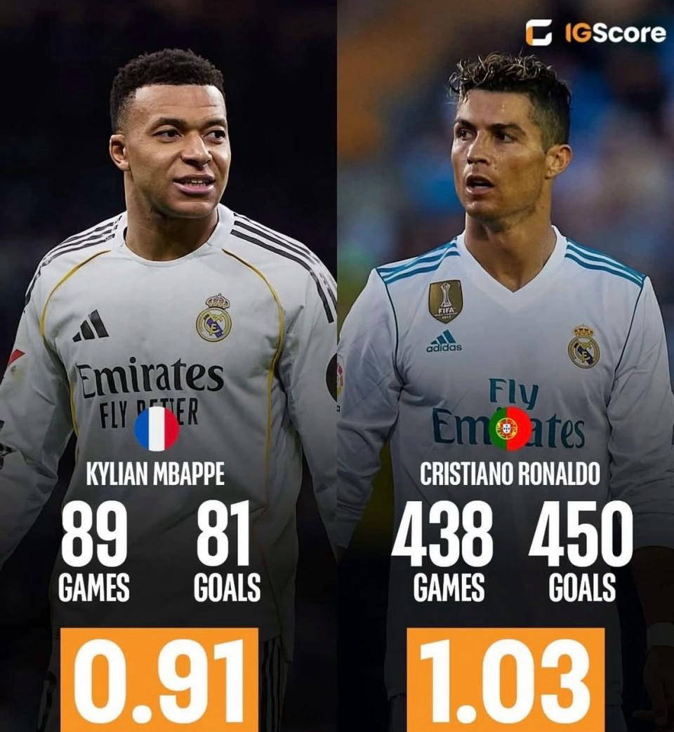 当基利安·姆巴佩在加盟皇家马德里后的前89场比赛中轰入81球,场均接近0.91球时,这样的效率已足以令任何时代的射手肃然起敬。然而,当这组数据被放在克里斯蒂亚诺·罗纳尔多的皇马生涯坐标系中对比,差距便不再只是“爆发力”,而是“持续力”。C罗为皇马出战438场攻入451球,场均1.03球——更重要的是,他把这一效率维持了九个赛季之久。