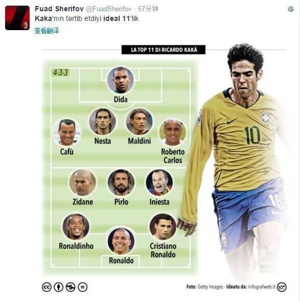 足坛最佳11人,每个人都有自己心里的一套阵容,巨星卡卡就给出了自己心中的最佳11人,主要是以在AC米兰和皇马效力过的球员为班底,现役球员中皇马当家球星C罗入选。