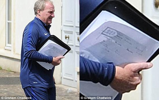 在结束今天的训练后,英格兰主帅霍奇森以及助教莱文顿返回驻地,不过后者却把写有战术的图纸露了出来,这也被《每日邮报》拍个正着!