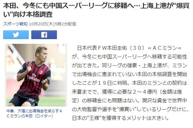 日媒指出,本田圭佑的名字已经和上港联系在了一起,因为米兰也想清洗本田圭佑,因此,上港拿下本田圭佑只需要4亿日元,折合人民币,转会费才2600万,甚至远不如很多天朝本土球员的转会费。