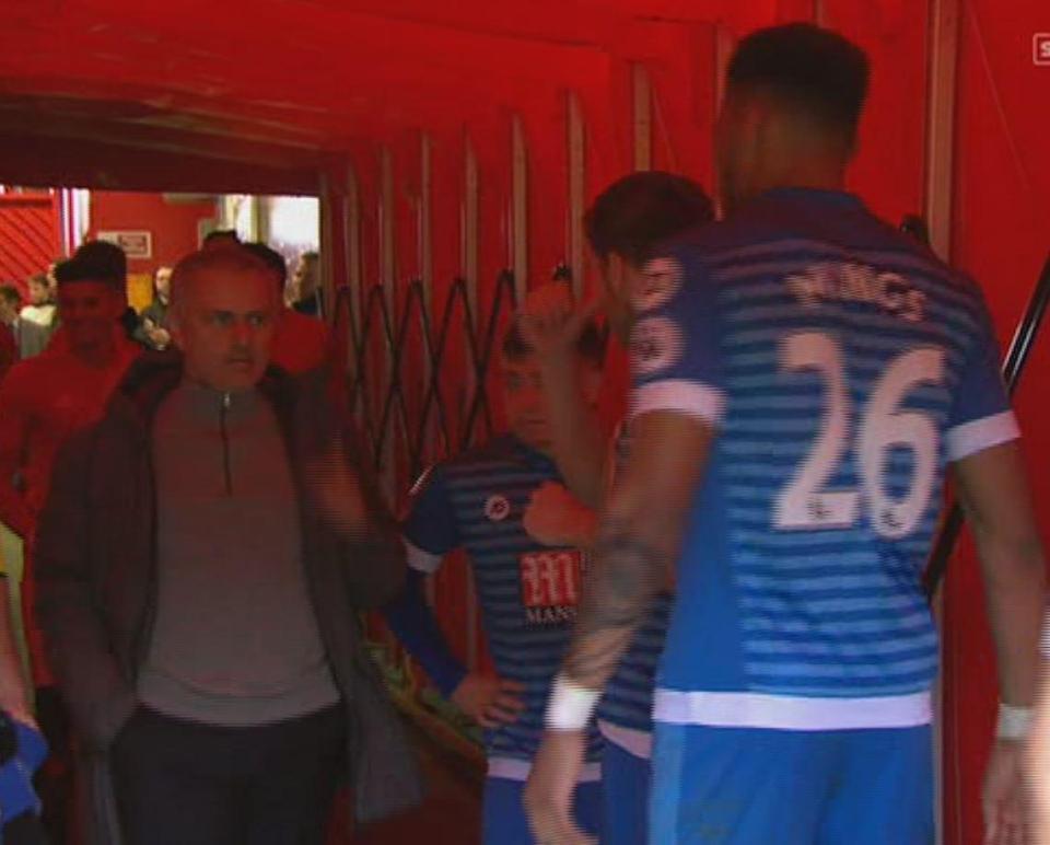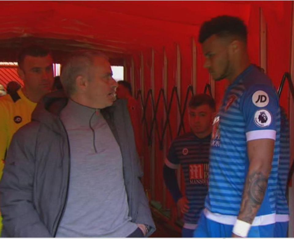 半场休息后,怒不可遏的穆里尼奥在球员通道指责了明斯在场上的恶意犯规,而镜头前也可以发现,明斯也驳斥了穆里尼奥的言论,在一旁明斯的队友阿特也为队友挺身而出回击了穆里尼奥,穆里尼奥也毫不客气地回喷了爱尔兰中场。